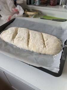 Ha letelt az idő és nagyjából duplájára kelt, akkor kapcsoljuk be a sütőt 220C°-ra és tegyünk be egy hőálló tálat amiben víz van, hogy vízgőzben süshessük majd a kenyerünk. A kenyeret ekkor bespricceljük vízzel és simaliszttel megszórjuk, amit nagyon finoman simítunk el a tésztán, úgy hogy nehogy benyomjuk a kezünkkel közben! Végül egy nagyon éles késsel 45 fokos szögben vágjuk be a tésztát 1cm mélyen 3-4 helyen.